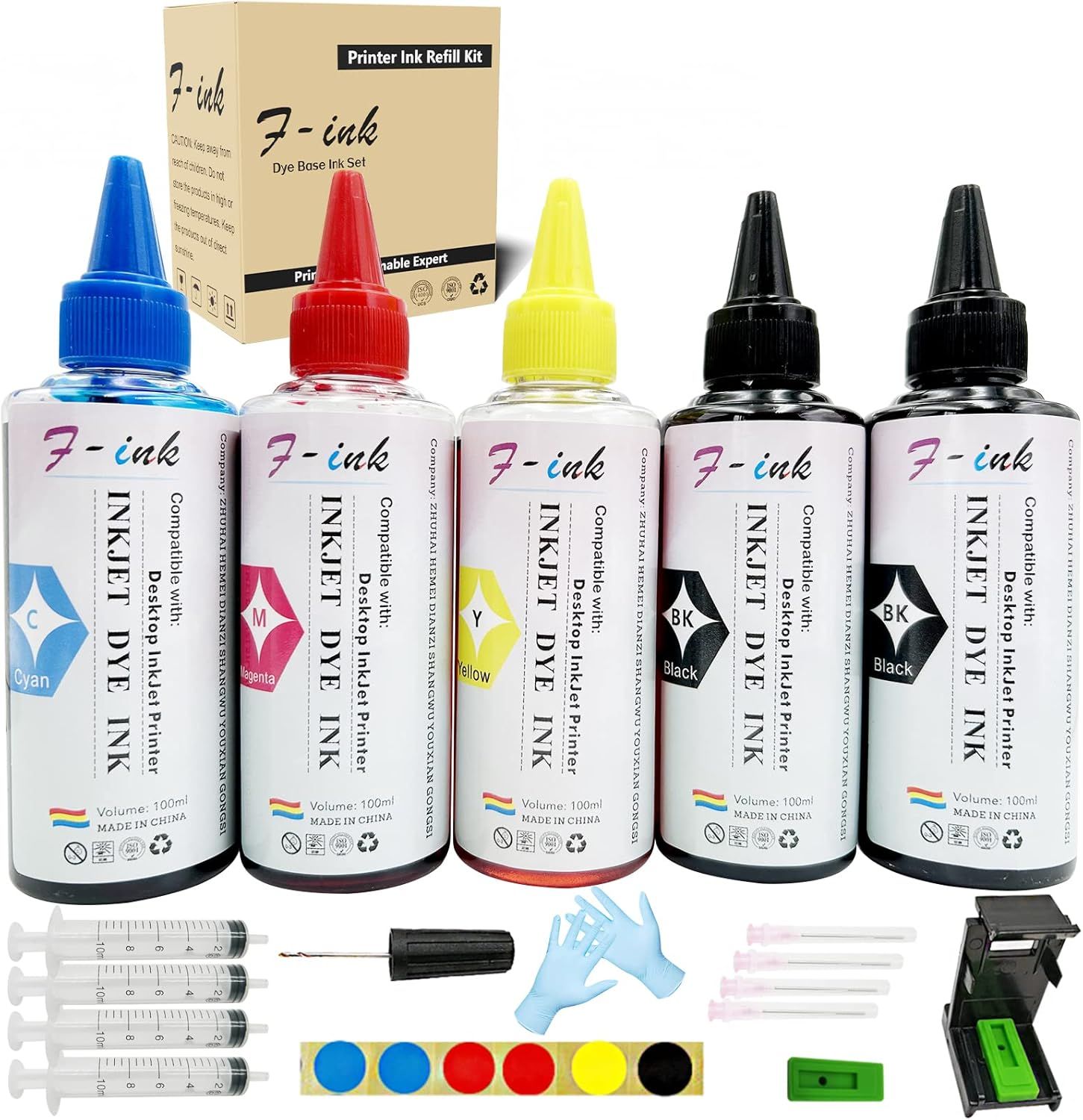 F-INK Lot de 5 flacons d'encre et de recharge d'encre de 100 ml compatibles avec cartouches d'encre HP 304 302 650 62 652 300 301 304XL 652XL 300XL 650XL 302XL 62XL 301XL avec outils de recharge