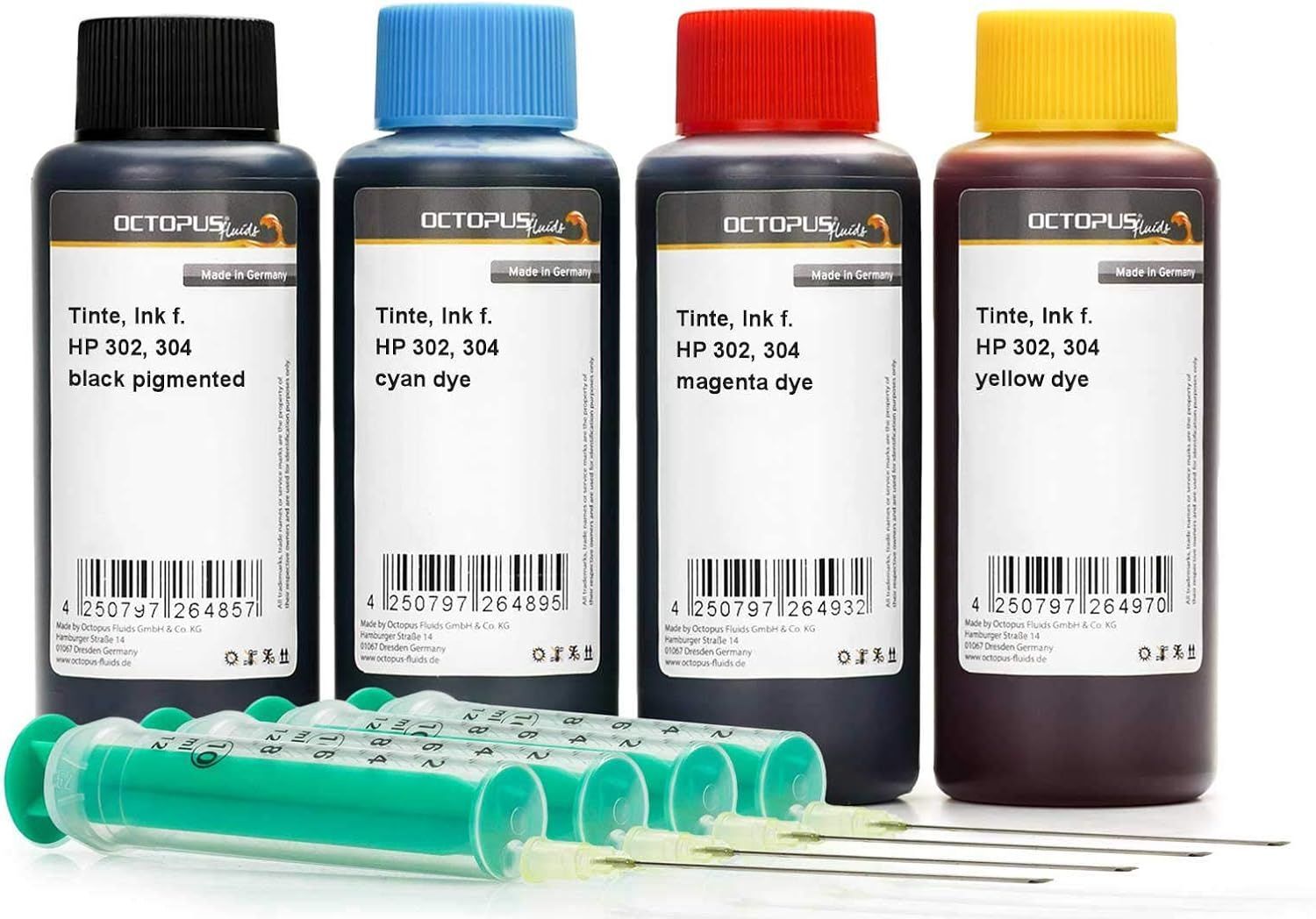 4X 100ml Encre d'imprimante Compatible pour Cartouches HP 302, HP 304 Noir, Cyan, Magenta, Jaune, Set Complet avec Encre de Recharge, seringues de Recharge et Gants (sans OEM)