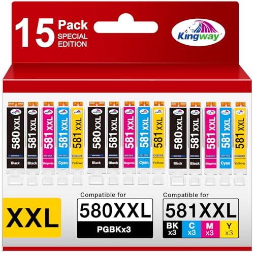 KINGWAY 580 581 XXL Cartouches Encre Compatibles pour Canon PGI-580 CLI-581 XXL Multipack pour Canon Pixma TS6350 TS705 TS8350 TS8352 TS9550 TS6351 TS8351 TR8550 TR7550 TS9150 (15 Pack)