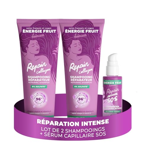 ENERGIE FRUIT Collagen Repair - Routine Cheveux Réparatrice - 2x Shampoing Réparateur + Sérum Anti-Casse - Collagène Végétal & Protéine - Cheveux Abîmés, Cassants, Secs - 96% Naturel - 2x250ml + 100ml