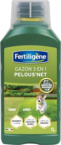 FERTILIGENE FGAZLIQ1 - Engrais Liquide Gazon 3 en 1 Pelous'Net 1 L - Reverdit le gazon - Limite mauvaises herbes et l'apparition des mousses - Avec bouchon doseur - Pour 67 m² - Fabriqué en France