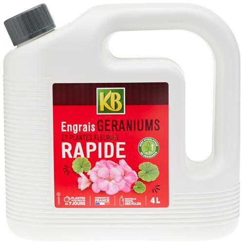 KB KBGER4N - Engrais Liquide Rapide Plantes Fleuries Géraniums, Vivaces 4 L - Plantes Plus Belles en 7 Jours - avec stimulateur de Croissance - Jusqu'à 568 L de Solution diluée - Fabriqué en France