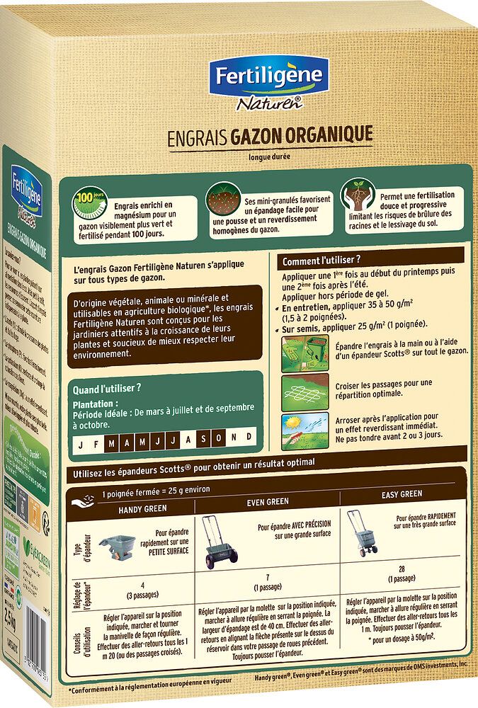 Fertiligène Engrais Gazon Organique 2,5 kg - Reverdit en 7 jours - 100 jours de nutrition - Limite les risques de lessivage - Pour 100m² (Lot de 2)