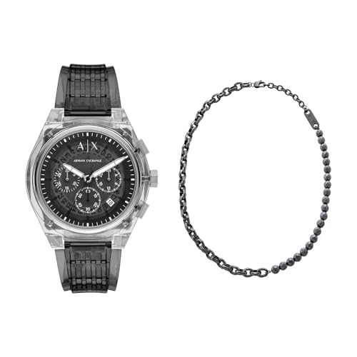 Armani Exchange Homme Montre en Polyuréthane Gris et Collier Gunmetal Acier Inoxydable, Ensemble