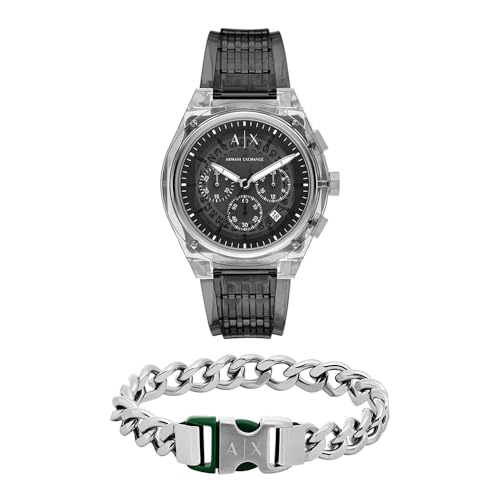 Armani Exchange Homme Montre en Polyuréthane Gris et Bracelet Noir Acier Inoxydable, Ensemble