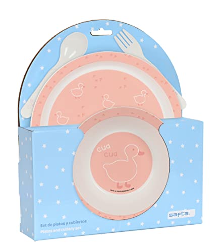 Safta - Ensemble assiettes et couverts, paquet, assiette, couvert, bébé, initiation, nourriture, confortable et polyvalent, 22,5 x 5,5 x 26 cm, couleur rose bâton, Rose pâle, Estándar, Décontracté