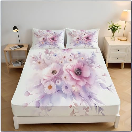 Ensemble De Draps 3 Pièces 160X200Cm, Draps De Lit en Microfibre De Polyester Brossée. Drap Plat, Drap-Housse Ajustable Et 2 Taie d'oreiller, Fleurs Pastel Esthétique Botanique