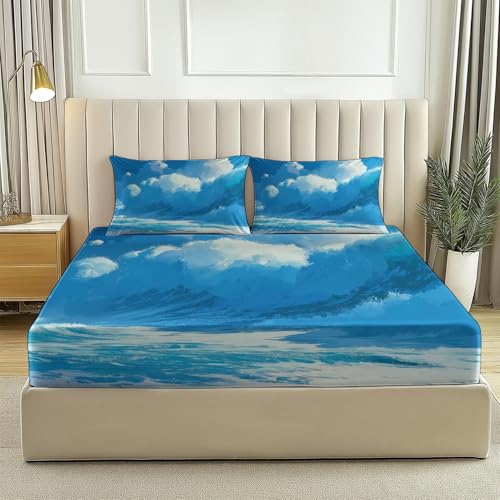 Ensemble Drap Housse Et Taie d'oreiller, Imprimé Minimalisme Art Vagues De L'Océan Microfibre avec Élastique pour Matelas Epais - Draps Housse Confortable (160 x 200 + 30 cm,Bleu)