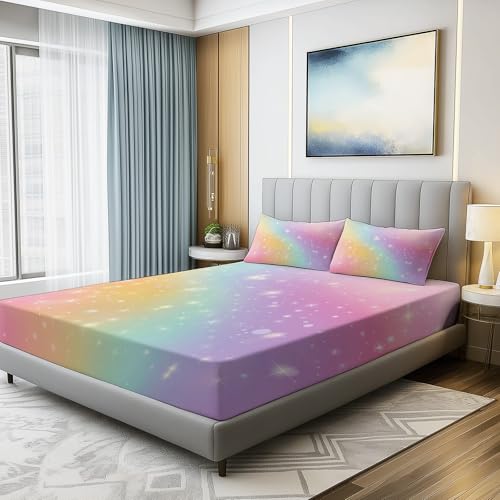 Ensemble Drap Housse Et Taie d'oreiller, Imprimé Étoiles Oniriques Dégradées Microfibre avec Élastique pour Matelas Epais - Draps Housse Confortable (160 x 200 + 30 cm,Couleur)
