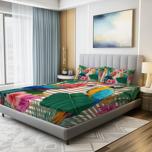 Ensemble Drap Housse Et Taie d'oreiller, Imprimé Rayures Art Plantes Tropicales Oiseaux Microfibre avec Élastique pour Matelas Epais - Draps Housse Confortable (160 x 200 + 30 cm,Couleur)