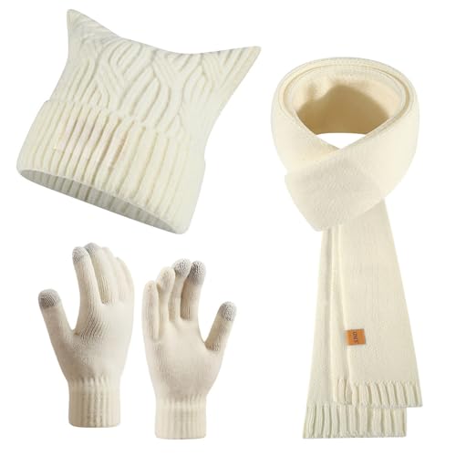 Packs Bonnet, Écharpe Et Gants Femme 3 en 1, Ensemble Hiver Femme 3en1 Bonnet Echarpe Gants Tricoté Chauds Écharpe Hiver Bonnet Tricoté avec Doublure Chaude en Laine Mode pour Extérieur Ski Sports