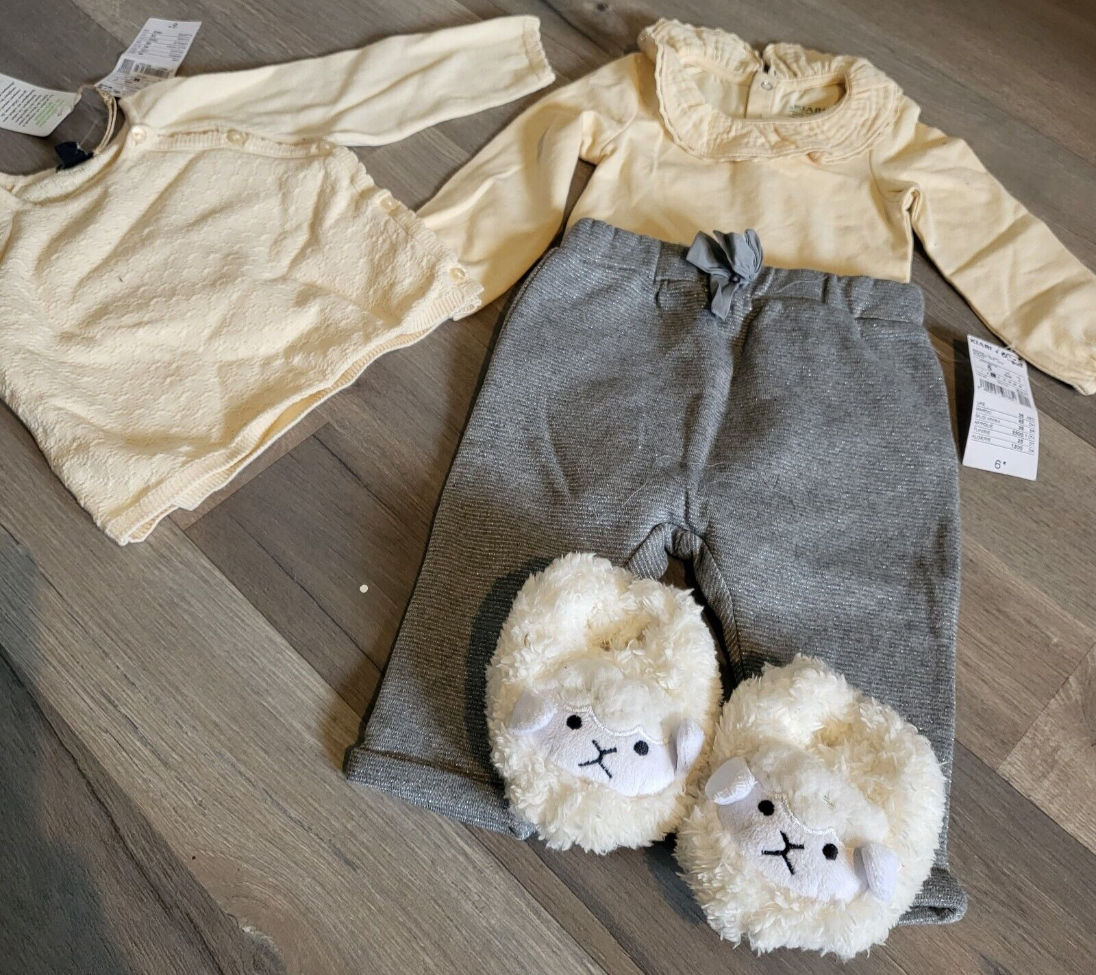 KIABI Ensemble legging + gilet crème + t shirt body + chaussons Taille 6 mois