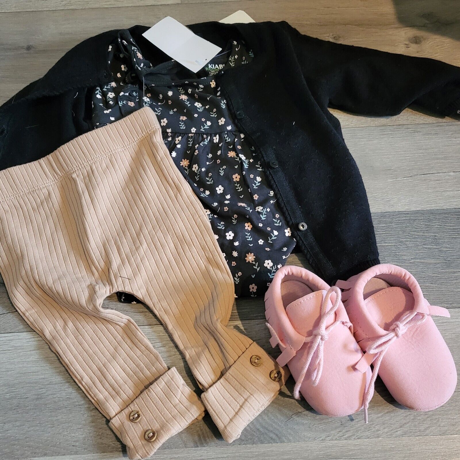 KIABI Ensemble legging beige + t shirt + gilet noir + chaussons Taille 6 mois
