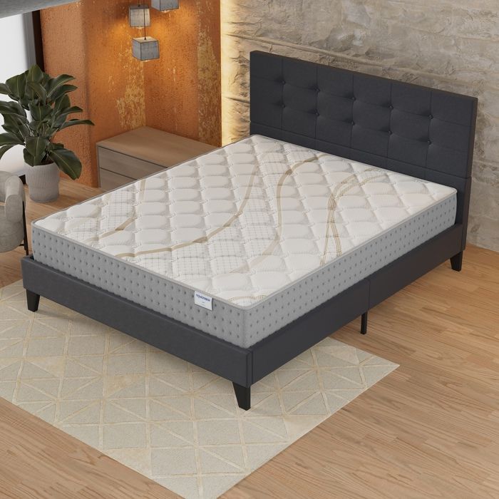 Ensemble matelas + lit 120x190 cm, matelas 25cm ressorts ensachés, accueil mousse, lit à lattes en bois, tissu gris Essem + Alya