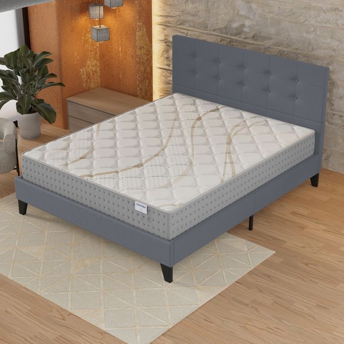 Ensemble MATELAS + LIT (120x190cm)- Essem 25cm Ressorts ensachés & Mousse HDensité + Sommier stable & tête de lit revêtement Gris