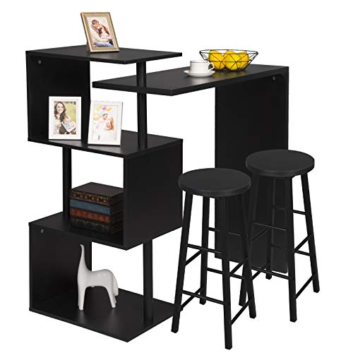 WOLTU Table de Bar Rotatif avec 2 Tabourets, Mange Debout de Bar avec 3 tablettes, Ensemble Table et chaises en métal et MDF pour Cuisine, Bar, Bistro, Noir