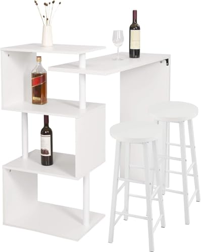 WOLTU Table de Bar Rotatif avec 2 Tabourets, Mange Debout de Bar avec 3 tablettes, Ensemble Table et chaises en métal et MDF pour Cuisine, Bar, Bistro, Blanc