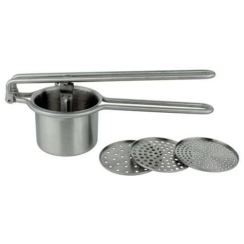 Chef Aid Pressepurée en acier inoxydable, outil idéal pour purée de pommes de terre, aliments pour bébés, légumes et fruits, avec boucle de suspension pratique, lavable au lavevaisselle, argenté