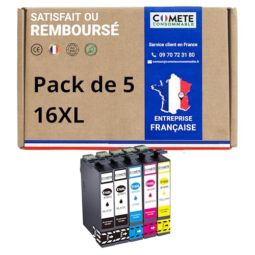 COMETE, Marque française - 16XL - 5 Cartouches d'encre Compatibles avec Epson 16 XL Stylo Plume - pour Cartouche Epson Workforce WF 2510 WF 2010 2520 2530 2540 (2 Noir et 3 Couleur)