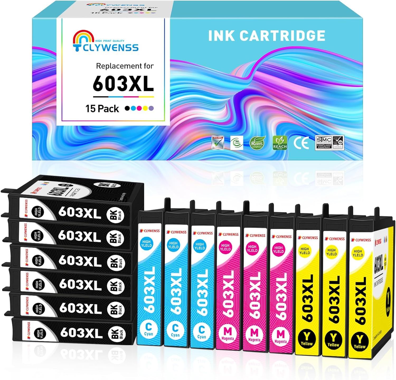 CLYWENSS 603XL 603 XL Cartouche d'encre Multipack Compatibles avec Epson Expression Home XP-2100 XP-2105 XP-2150 XP-2155 XP-3100 XP-3150 XP-3155 XP-4100 4150 WorkForce WF-2810 WF-2820 WF-2830, 15-Pack