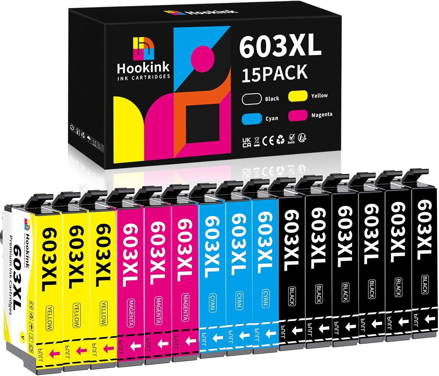 Hookink 15-Pack 603XL Cartouches d'encre Compatible avec Epson 603XL 603 XL pour Expression Home XP-2100 XP-2105 XP-2150 XP-2155 XP-3100 XP-3150 XP-3155 XP-4100 XP-4150 WF-2810 WF-2820 WF-2830