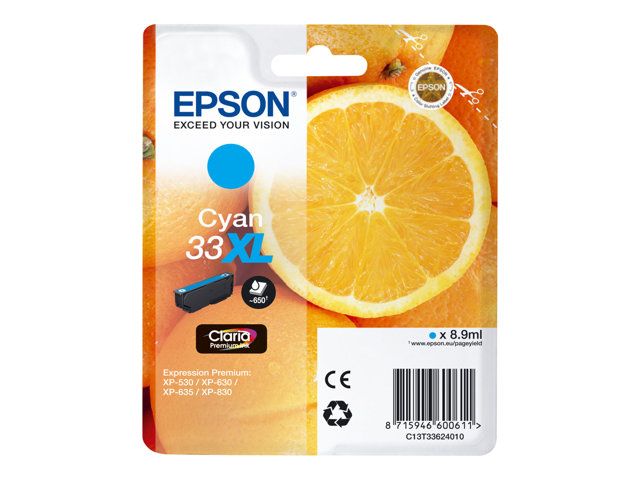 Epson 33XL - 8.9 ml - haute capacité - cyan - originale - blister - cartouche d'encre - pour Expression Home XP-635, 830; Expression Premium XP-530, 540, 630, 635, 640, 645, 830, 900