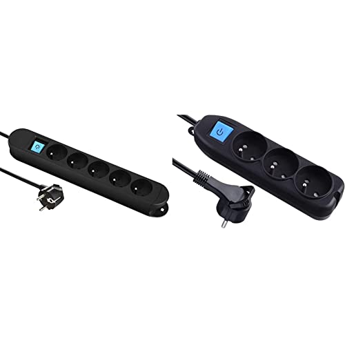 Electraline Bloc Multiprises Professionnel de Travail avec 2 aimants pour Fixation, 5 Prises 16A, Câble 3 m, H05VV-F 3G1.5 mm²& Bloc Multiprises 3 prises, interrupteur et fiche Plate - 1,5m, noir