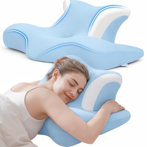 COSYLAND Oreiller Mémoire de Forme pour Dormeurs Latéraux – Oreiller Ergonomique Cervical pour la Nuque, Cavités pour Les Oreilles, Mousse à Rebond Lent, Housse Amovible et Lavable, Bleu Ciel