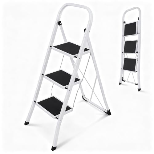 KINGRACK Escabeau 3 Marches avec Verrouillage de sécurité, Large Pédale Antidérapante, Escabeau Pliable avec Mains Courantes, Échelle Domestique pour Maison, Cuisine, Bureau, Léger Portable, Noir