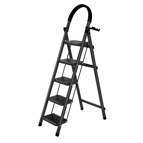 KINGRACK Escabeau 5 Marches avec Plateau à Outils et Large Pédale Antidérapante, Marche Pied Pliable avec Mains Courantes, Échelle Domestique pour Maison Cuisine Garde-Manger Placards et Bureau, Noir