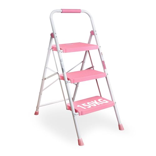 BONTEC Escabeau 3 Marches, Charge 150 kg Escabeau Pliable, Larges Marche Pied Pliable Antidérapantes, Tabouret en Acier Marche Pied Adulte, Poignée en Éponge, pour Bureau/Cuisine, Rose