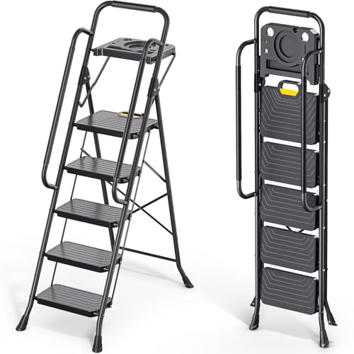BONTEC Escabeau 5 Marches Pliable en Acier, Charge 150 kg, Marche Pied Antidérapant, Plateforme de Travail avec Plateau Outils, Escabeau avec Main Courante pour Cuisine Atelier Entrepôt, Noir