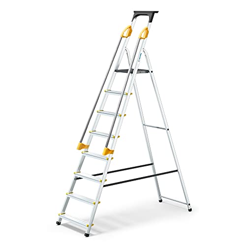 HOSTRÖM Escabeau 8 marches DURAMP sécurisé avec rampes, Tablette Porte-Outils, marchepied Pliable Aluminium, Hauteur Plateforme 162cm, Garantie 5 Ans