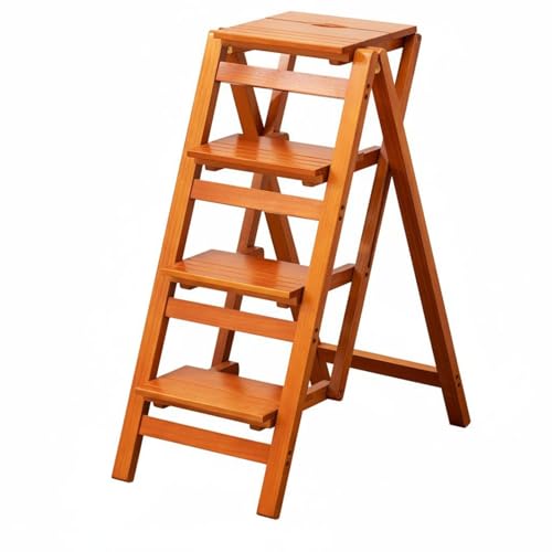 RjcdOPL Escabeau Chaise 2-en-1 à 4 Marches, Chaise Échelle Pliable, Bois de Pin Verni, Capacité 100 kg, Léger et Polyvalent, pour Salon, Cuisine, Bibliothèque, Jardin (Caramel)