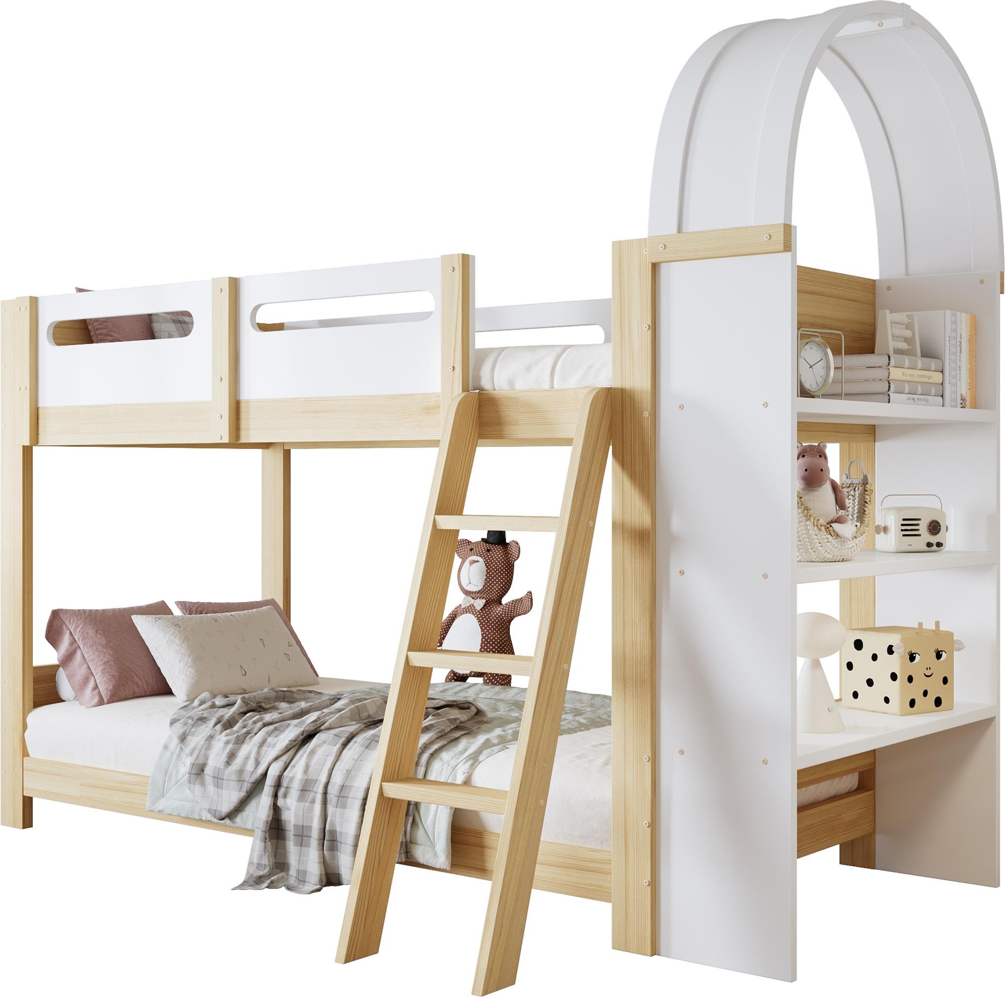 Merax Lit superposé 90x200cm avec étagère à 3 niveaux et barrière de lit, lit d'enfant avec escabeau et sommiers à lattes, pin+MDF+contreplaqué, blanc+naturel