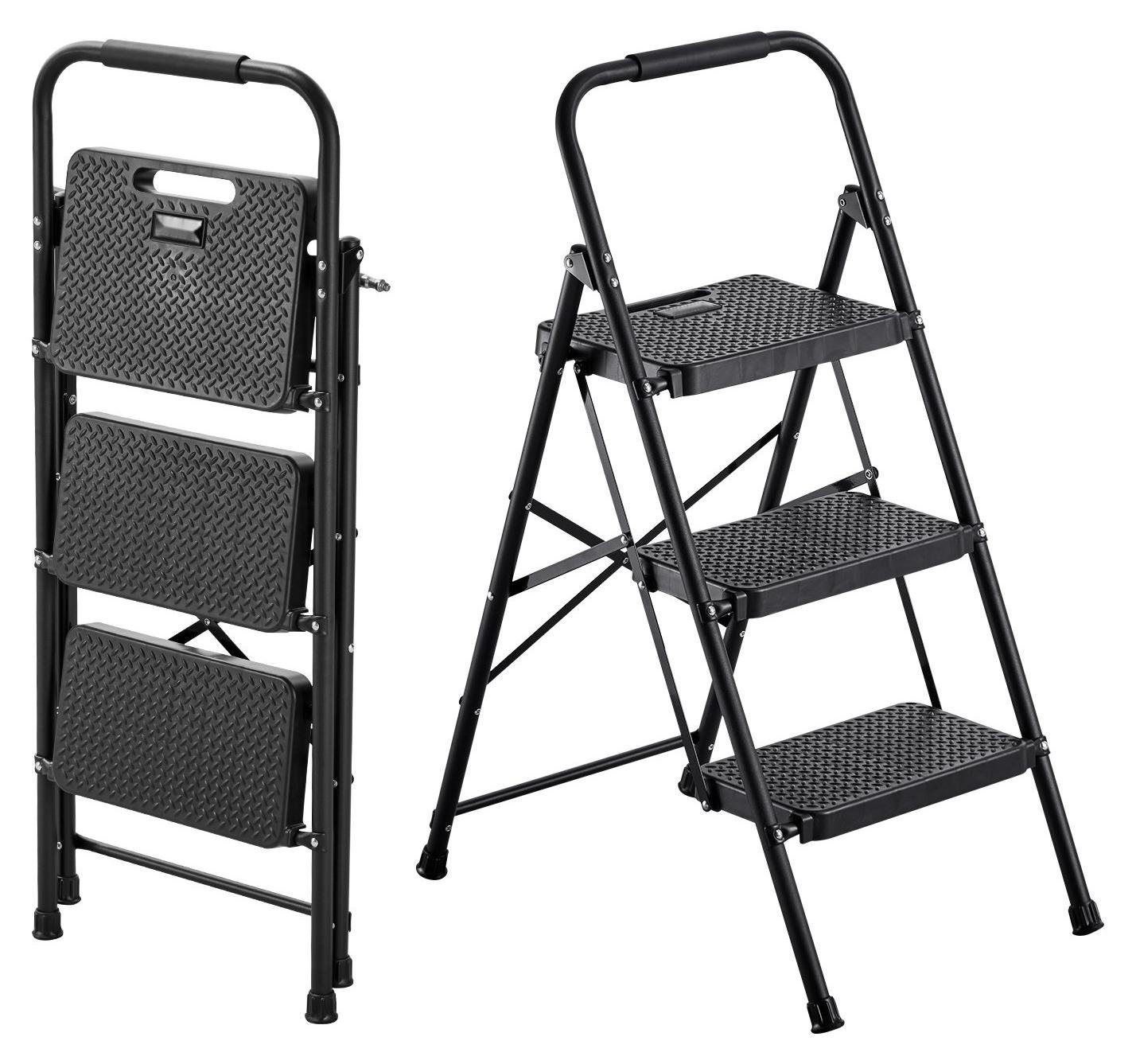 Escabeau - Échelle pliante à 3 marches / marchepied pliant - Marches antidérapantes - Poignée confortable - Capacité de charge de 272 kg - Pliable pour un gain de place - Pour la cuisine, la maison et le bureau - Noir