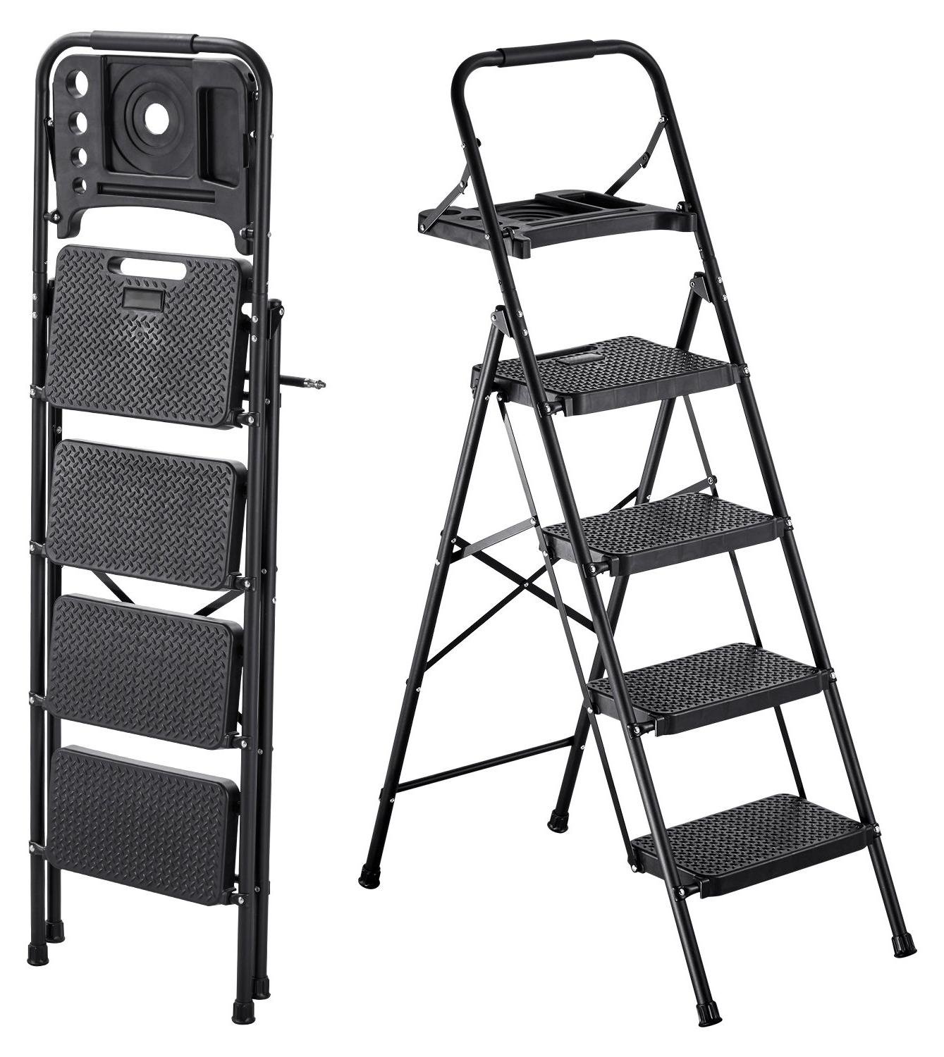 Escabeau - Échelle pliante à 4 marches, échelle ménagère - Capacité de charge 272 kg - Avec tablette à outils - Poignée confortable - Marches antidérapantes - Pour la cuisine, la maison et le bureau - Noir