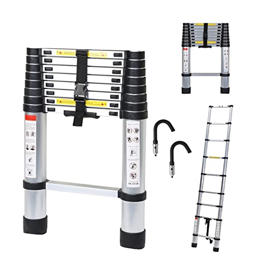 Randaco 2.6M Échelle Télescopique avec 2 Crochets Amovibles, Escabeau Telescopique Aluminium, Extensible Echelle Extensible Antidérapante Echelle Polyvalente Charge Max 150 kg