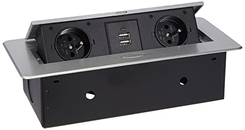 Perel Multiprise escamotable encastrable avec 2 Prises Schuko Type F et 2 Ports USB, Trou 71 mm, câble 1,4 m, 3680 W, idéale pour Cuisine, Bureau et Salle de réunion