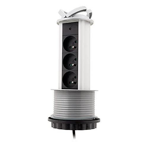 Perel Multiprise escamotable encastrable avec 3 Prises Schuko Type E, Trou 71 mm, câble 1,4 m, 3680 W, avec Protection Enfant, idéale pour Cuisine, Bureau et Salle de réunion