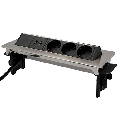 Unitec Multiprise escamotable horizontale | 2 prises de charge USB | 3 prises | rabats de fixation inclus | câble de raccordement et prise d'alimentation