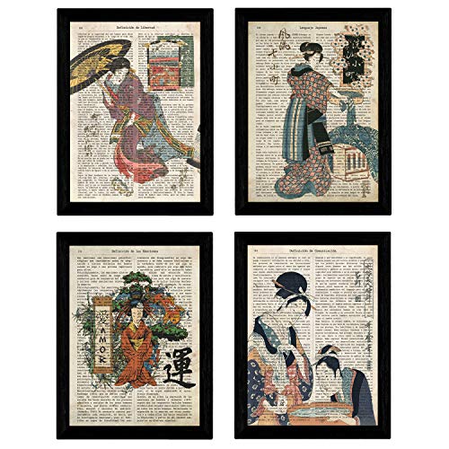 Nacnic Set 4 Affiches Style Oriental Vintage. Affiches de Geishas japonaises avec texte en espagnol (liberté, langue japonaise, communication, émotions). Image de l'art ancien en Asie. Format A4.