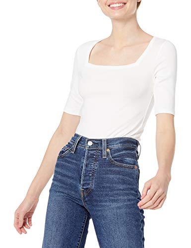Amazon Essentials T-Shirt Ajusté à Manches Mi-Longues et Col Carré Femme, Blanc Vif, M