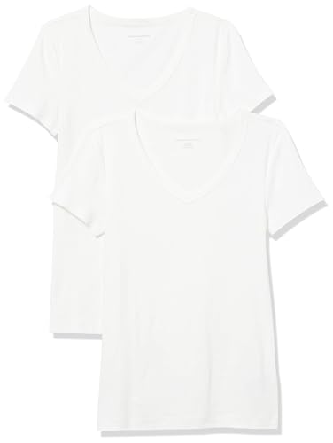 Amazon Essentials T-Shirt Col en v à Manches Courtes Coupe Ajustée Femme, Lot de 2, Blanc, M
