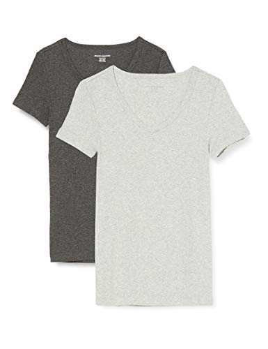 Amazon Essentials T-Shirt Col en v à Manches Courtes Coupe Ajustée Femme, Lot de 2, Charbon Chiné/Gris Clair Chiné, XL