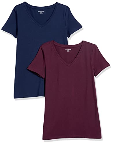 Amazon Essentials T-Shirt à Manches Courtes, Coupe Standard (Ras-de-Cou et Col en V) Femme, Pack of 2, Bordeaux/Bleu Marine, XL
