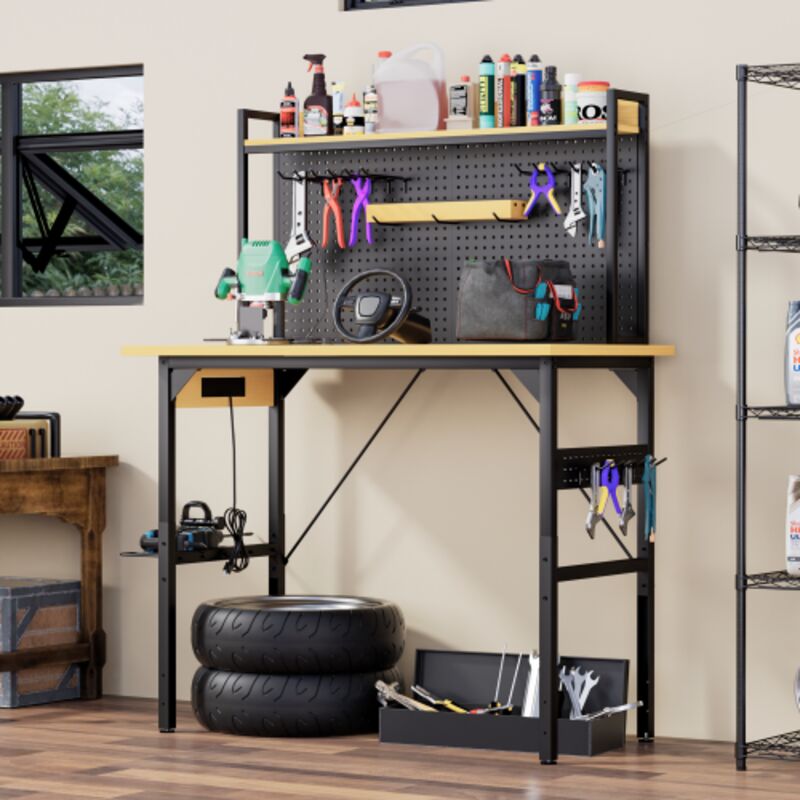 Établi mobile réglable en bois, avec prise AC/USB, panneau perforé, roulettes, crochets, étagère, capacité de charge 700 kg, 48 pouces, pour garage,