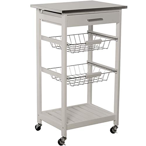DRW Chariot de Cuisine avec 1 tiroir et 2 paniers + étagère en Bois : pin et MDF avec Couvercle en Acier Inoxydable de Couleur Blanche 47 x 37 x 81,5 cm