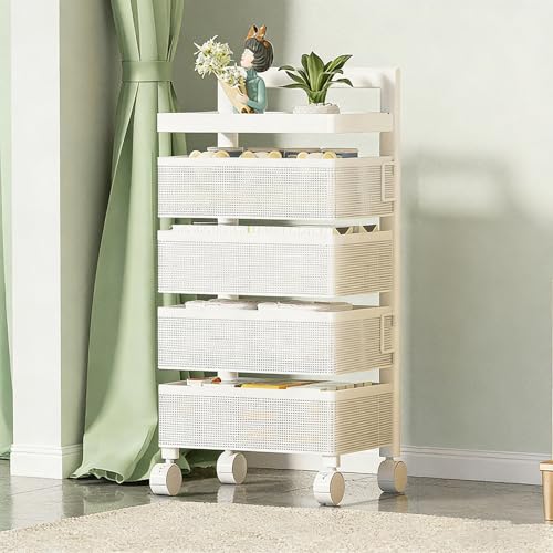 BK&MF Chariot de Cuisine Plastique Empilable 4 Niveaux avec roulettes, Panier de Rangement Légumes Fruits, Étagère à Snacks Aérée pour Cellier, Salon,Apricot,4 Tier
