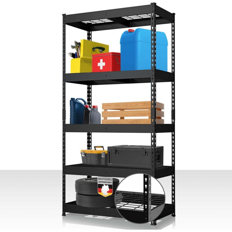 Étagère pour charges lourdes Yukon Rivet Étagère en acier avec tablettes grillagées Noir 180 x 90 x 45 cm, 5 étages